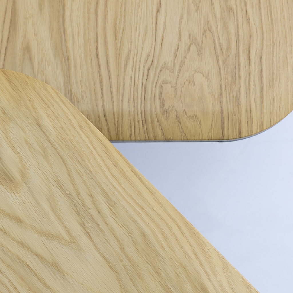 Elevate your interior with this architectural nesting table set, designed to bring a balance of texture and modern form to your living space. The set includes two tables of varying heights, featuring light oak-finished tops that highlight the unique, natural beauty of the wood grain. These warm, textured surfaces are offset by thick, midnight black plinth bases, providing a grounded and monolithic aesthetic.