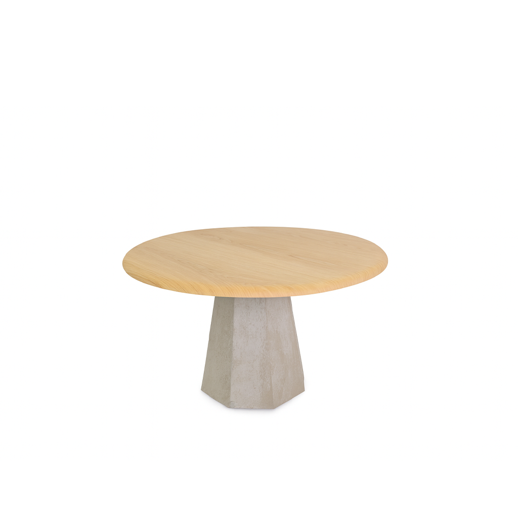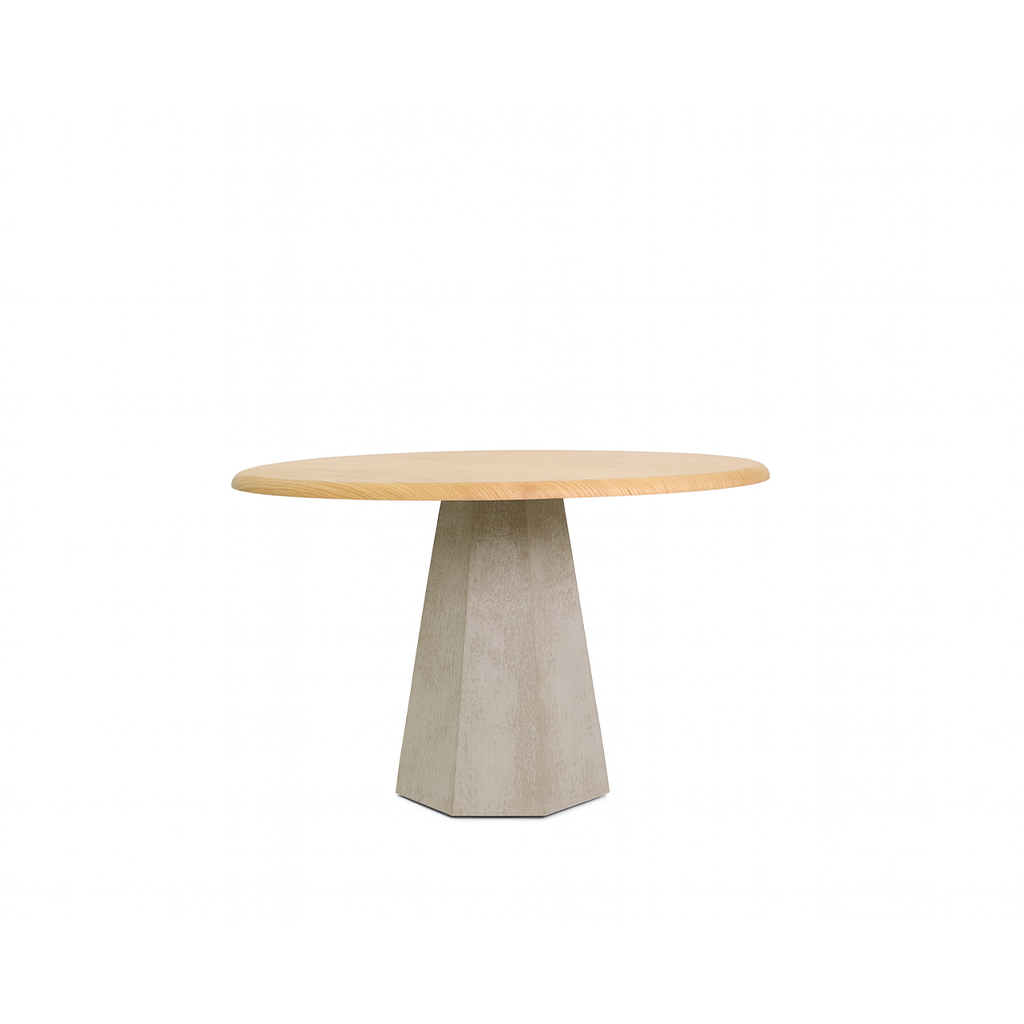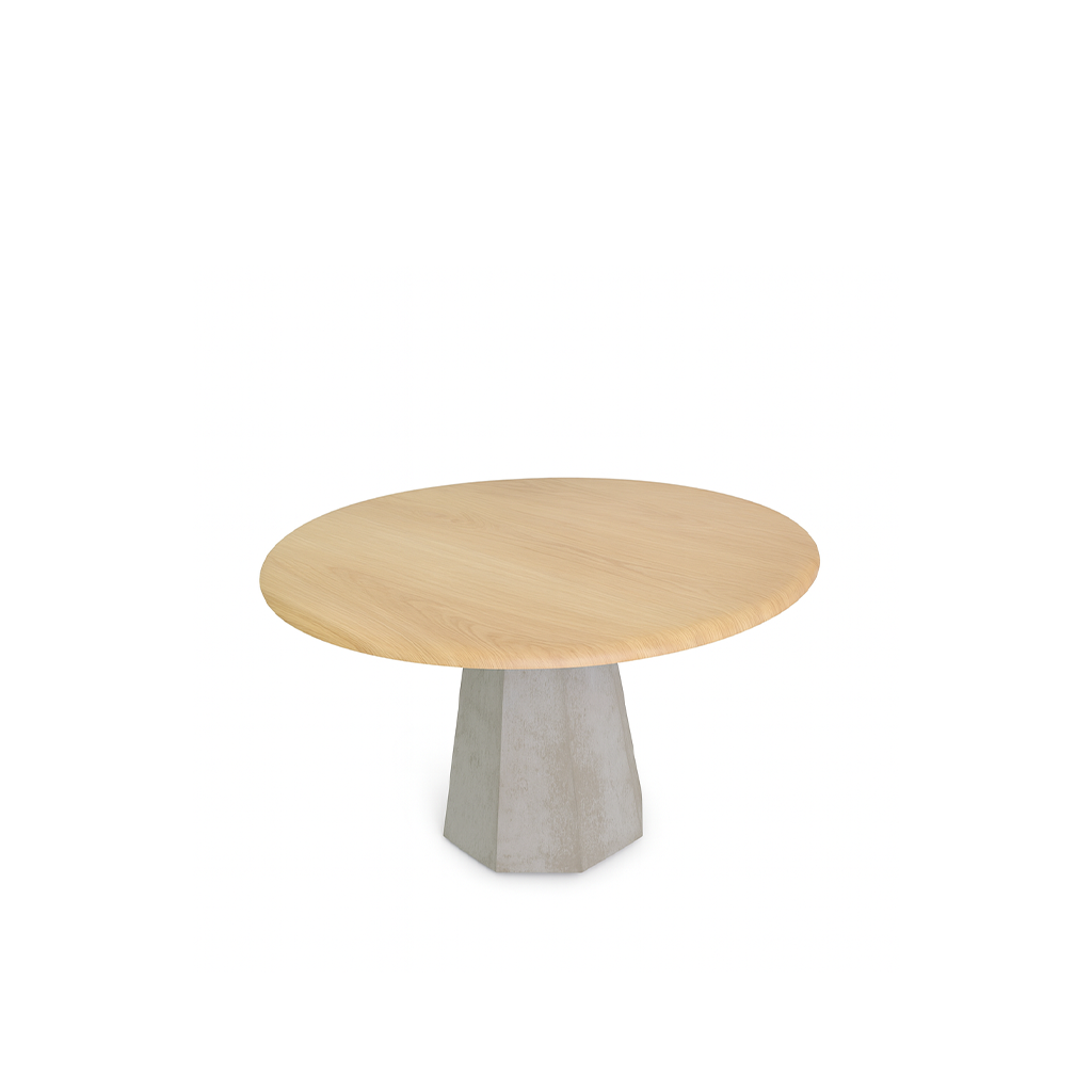 The tabletop is crafted with a beautifully grained light oak finish, featuring rounded edges that soften the overall look and provide a safe, comfortable dining surface. Anchoring the piece is a geometric pedestal base with a textured, light gray stone finish. The multi-faceted heptagonal shape provides a sturdy, wobble-free foundation while offering a unique architectural detail that shifts in appearance depending on the light. Because it lacks traditional outer legs, this table offers maximum flexibility for chair placement and ensures everyone has plenty of legroom.