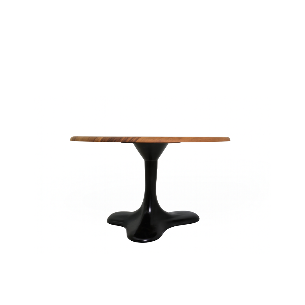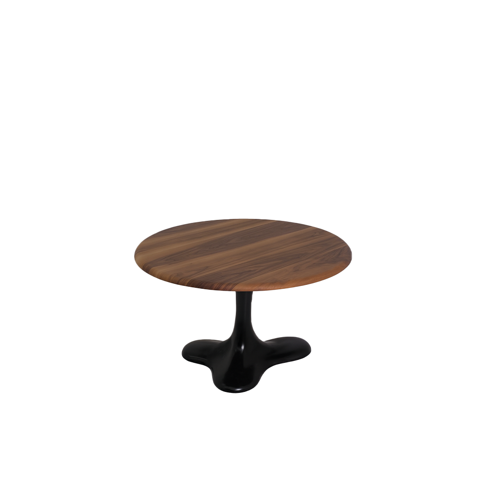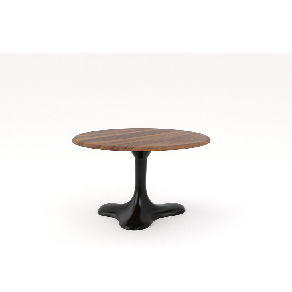 Supporting the warmth of the wood is a biomorphic pedestal base finished in a sleek, liquid-black gloss. The base transitions from a slim neck into a weighted, three-lobed “clover” foot, providing excellent stability without the visual bulk of traditional legs. This pedestal design allows for unrestricted legroom and flexible chair placement, ensuring comfort for every guest. Whether placed in a contemporary kitchen or a mid-century inspired dining area, this table serves as a bold statement of modern style.